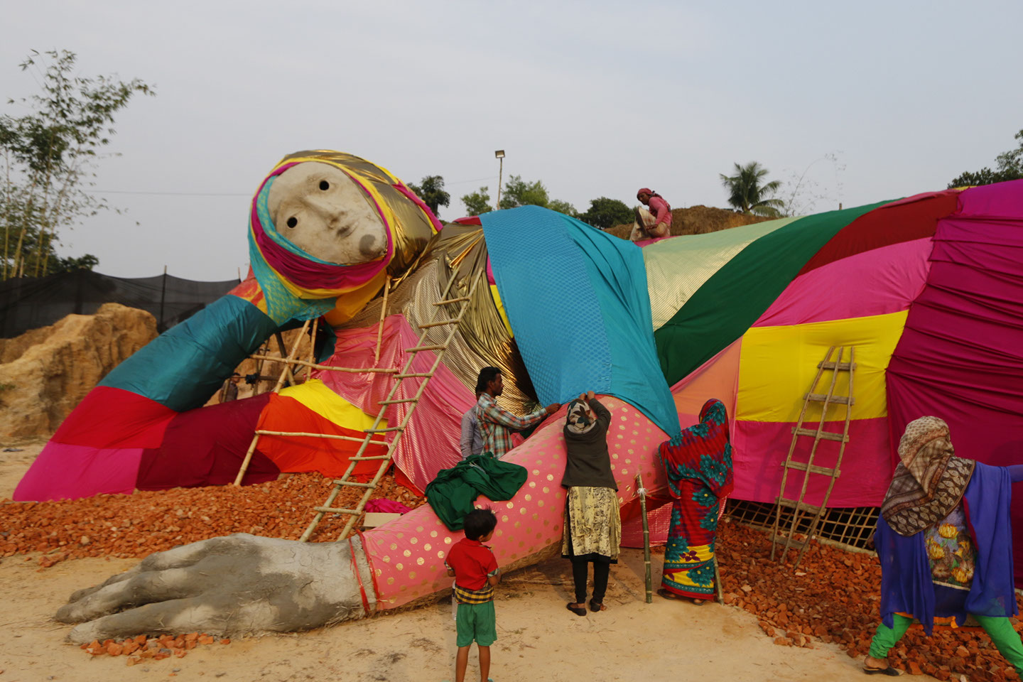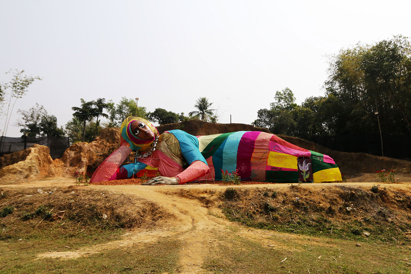 While Srihatta officially opens in 2019, the first work for the Park, ‘Rokeya’, was completed in February 2017 after two years of development – and speaks to the socially engaged practices that the institution plans to regularly host. As part of the annual Samdani Seminars programme, Polish artist Paweł Althamer – along with members of his community (neighbours) from Bródno, Poland – engaged patients of Protisruti (the Promise) drug rehabilitation centre in Sylhet and the local community in an eight-day-long creative and collaborative Sculptural Congress workshop. This first project at Srihatta was realized in partnership with Bródno Sculpture Park, which Pawel Althamer inaugurated in 2009 with the Museum of Modern Art Warsaw. Bridging understanding across social and cultural divides, they created the communal work of art, ‘Rokeya’, which the village children named after the nineteenth century pioneer of female education in Bangladesh, Begum Rokeya. The resulting sculpture is a reclining woman constructed of locally woven palm fronds over a bamboo frame. She wears a colourful fabric costume stitched from local textiles by nearby village women, who also helped to drape the fabric. ‘Rokeya’ also contains a kiln inside, for village children to use in ceramic workshops.